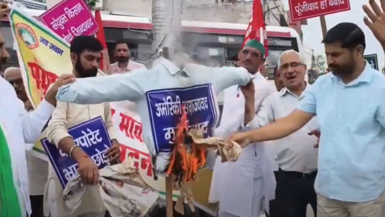 Farmers and Congress employees protested President Trump’s decision to impose a 50% duty on Indian goods in Doiwala city by staging a procession yelling slogans and burning the effigy. Watch video to know more